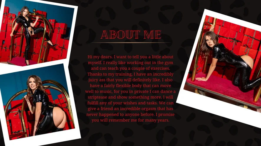 Cowgirl, Latex, Yoga, Heels, Leather, Nipple Toys, Sex Toys, Oil Show, Spanking, Erotic Dance, Twerk, Striptease, Upskirt, Foot Fetish, Topless, Dirty Talk, Handjob, Orgasm, Doggy Style, Dildo or Vibrator, Facial, Masturbation, Fingering, Blowjob, Cock Rating, Deepthroat